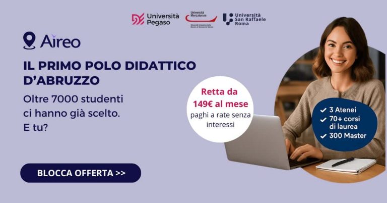 Siamo il polo didattico ufficiale delle università Pegaso, Mercatorum e San Raffaele, con sedi fisiche in Abruzzo e un sistema di tutoraggio attivo e personalizzato. Aireo Formazione è oggi il punto di riferimento per chi cerca un’università di qualità, accessibile e umana, che ti accompagna davvero — dalla scelta del corso fino al giorno della laurea.